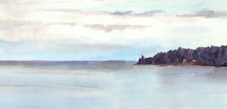 Blick Auf Das Wasser Landschaft See Oder Meer Insel Himmel Mit Wolken Und Weisse Segel Aquarell Gemalt Zeichnung Lizenzfreie Fotos Bilder Und Stock Fotografie Image 45474423