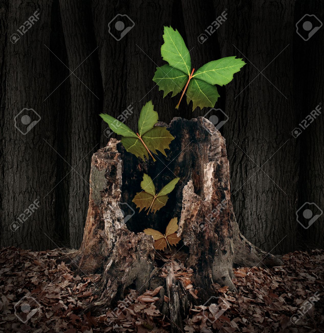 Leben Nach Dem Tod Und Der Wiedergeburt Konzept Als Eine Gruppe Von Blattern Als Fliegenden Schmetterlingen Steigt Aus Einem Toten Baumstumpf Verfall Als Symbol Der Seele Die Den Korper Der Eine Geburt Neuen