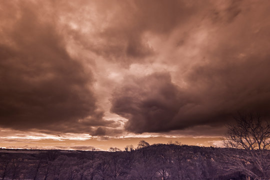 Eine Unbearbeitete Raw Foto Auf Den Sonnenuntergang Hinter Einigen Hugeln Die Untergehende Sonne Ist Durch Einige Tiefe Wolken Verdeckt Stockfotografie Alamy